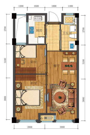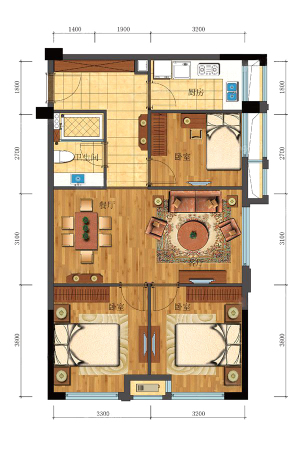各个空间户型方正,后期空间利用率高;卫生间没有窗子,可加管道通风,但是相对来说卫生间有窗户是 好的情况,利于排湿,不会使湿气进到室内。卧室进卫生间需要穿过餐厅或客厅;卧室作为较为重要的休息空间,尺寸合适,有利于主人更好的休息;客厅作为重要的会客空间,尺寸合适,能够保证主人会客需求。公摊高于15%且低