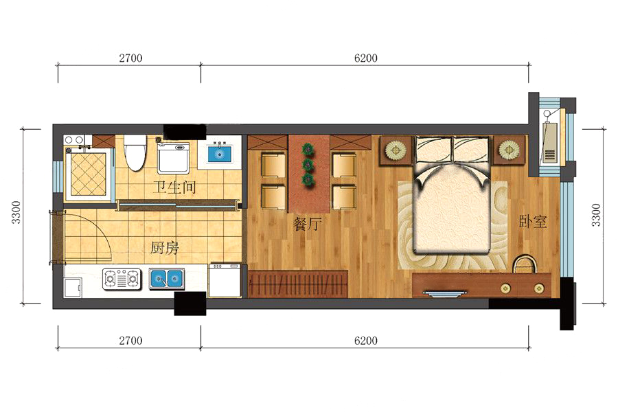 标准酒店式公寓格局,卫生间带窗,卧室朝东,方便采光、通风,后期居住方便。公摊高于15%且低于25%,符合住宅公摊正常范围。