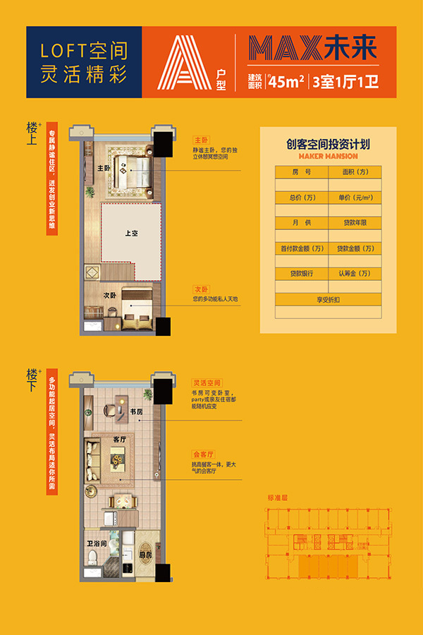 项目南侧城市主干道文一西路;海曙路与余杭塘路联通,两大城市主干道与杭州主城区相联。周边聚集欧美金融城、万达广场、余杭银泰城、西溪银泰城、赛银国际广场、未来中心、仓前老街、永乐城、西溪海港城、西溪新天地等10大旗舰型商业综合体,更是淘宝城、恒生科技园、海创园、梦想小镇天使村和互联网村、衢海大厦、杭州师范大学科技园等为代表等科创产业集聚区,是创客和高级白领的聚集地。项目东至创景路、南至龙潭路、西至汪桥港、北至红卫港,北侧和西侧被红卫港水系包围,两幢楼分别南北和东西布局,往东俯瞰余杭中央绿地公园,前后视野上无任何遮挡。 创客空间以城市创客型综合体为规划标准,集合了精装loft酒店式公寓/孵化平台/国际商业街等多种业态,总建筑面积约10万方。1号楼和2号楼均为精装lof酒店式公寓,每幢层高22层,1-2F商业裙楼定位为国际商业步行街,约6000方。主力户型40—50㎡,打造三房一卫独立产权公寓。项目引入杭开集团旗下的德石投资,着重打造创客孵化中心,以资本投入为创客群体护航。