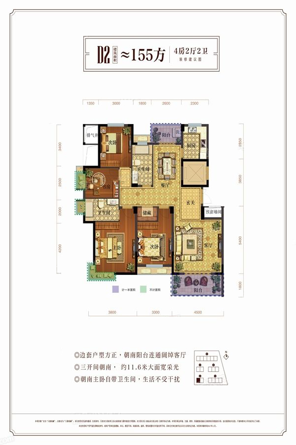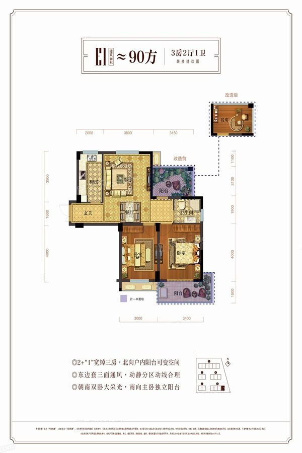 各个空间户型方正,后期空间利用率高;整个空间全明通透,采光良好,同时利于居住空间通风;整体空间布局合理,能够保证动静分离和居室通风,方便使用;各个功能区的尺寸比例规范,布局合理,能很好地满足日常功能需求,整体空间开阔,采光充足,居住舒适度好;公摊高于15%且低于25%,符合住宅公摊正常范围。