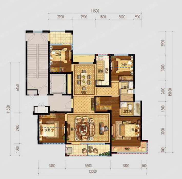 卧室:主卧套房式设计,功能齐全。 开间:三开间朝南,室内采光充足。 阳台:双卫干湿分离均为明卫,设计合理。