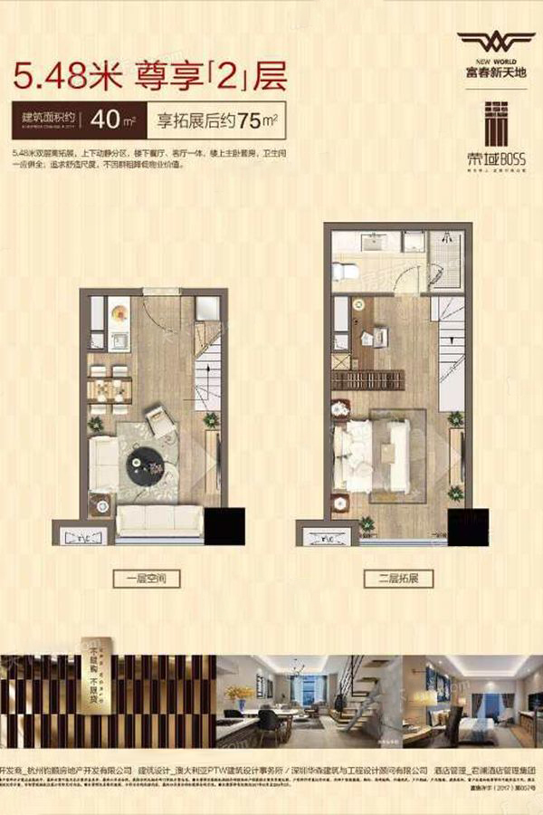 富春新天地荣域公馆主力面积40-50方,5.48米层高(可再拓展一层)40方可享75方,相当于买一层享2层,套房设计,追求舒适性,交付后统一装修,既可以免去装修带来的邻里干扰,又可以省去采购、装修的成本和时间。业主还可根据自己的个性和喜好打造,因此,很多有品位的时尚人士都喜欢这里,可以作为酒店接待、会所、居住等功能