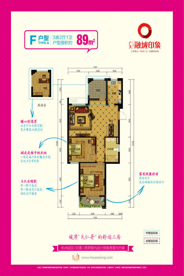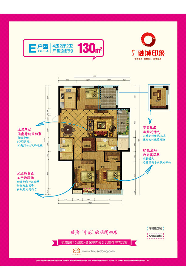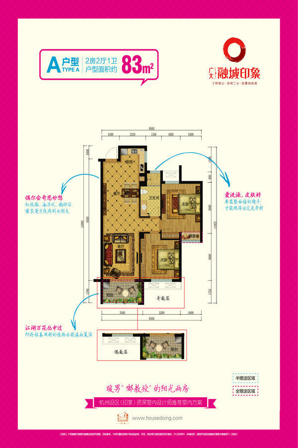 广大融城印象,位踞主城北丁桥板块,南邻惠北支路,西邻丁兰路。 项目占地3万余平米,总建筑面积逾10万平米,规划6幢高层公寓和1幢综合商业大楼,沿袭新古典设计风,坐拥10000方绿地面积,建筑的造型、色彩、立面、风格都恰如其分地与景观相呼应。80 -130平米青年iHome魔方户型,精致二房、豪奢三房、可变空间满足多样的生活需求。?