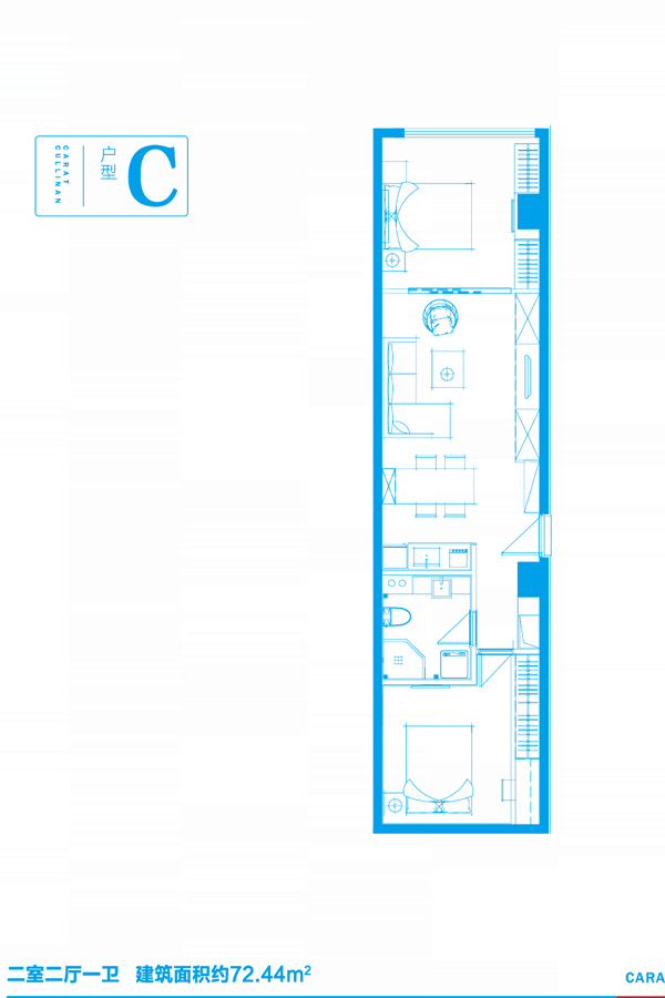 优点: 客厅方正,空间宽敞,适合接待来客; 厨房一字展开,与餐厅相连,方便上下菜; 双卧室设计,相对独立,兼顾收纳及办公空间; 缺点: 整体空间较为封闭,采光通风差; 餐厨与客厅开放,空间杂音、油烟共享; 卫生间无对外窗户,采光不好,排风透气差; 卧室门朝向客厅,私密性较差; 两卧室距离厕所较远;