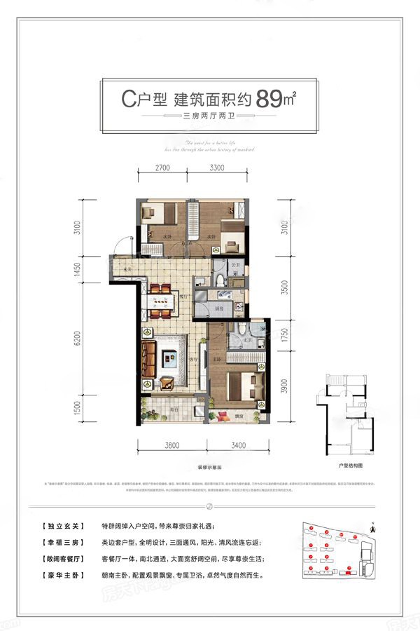 各个空间户型方正,方便室内家具布置;全明户型,各部分空间均有窗,可保证整体空间采光和通风,居住舒适度好;整个户型空间布局合理,做到了干湿分离、动静分离,方便后期生活;卧室厨卫等各个功能区的面积大小都比较合理,居住体验便利,整体舒适度高;公摊高于25%。