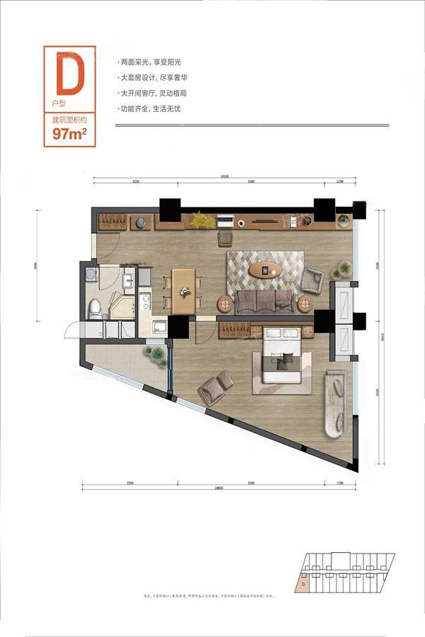 整体户型方正,活动区域开阔,居住舒适度高;户型不是南北通透,整体空间无穿堂风;整体空间布局合理,能够保证动静分离和居室通风,方便使用;客厅的面宽进深比不在标准范围内,装修时要选择适用尺寸的电视以满足观看距离;卫生间空间不算开阔,装修时要侧重实现其功能性;公摊高于15%且低于25%,符合住宅公摊正常范