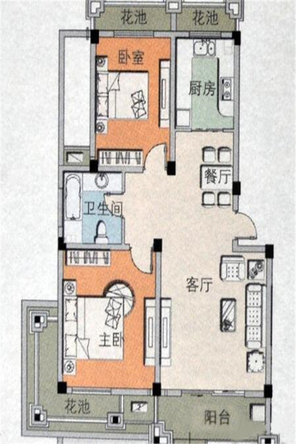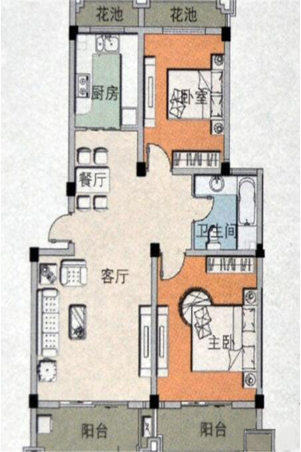 优势: 1.高得房率,双阳台设计。 1.客厅朝南,紧邻南面阳台,采光充足,空间方正通透。 2.主卧朝南,带阳台,采光充足,同时设有私人卫浴,保障隐私空间。 劣势: 1.餐厅和客厅没有完全一体设计,而且餐厅的空间还被过道占据一部分,不是很舒适。 2.户型进深长面宽短,采光不佳。