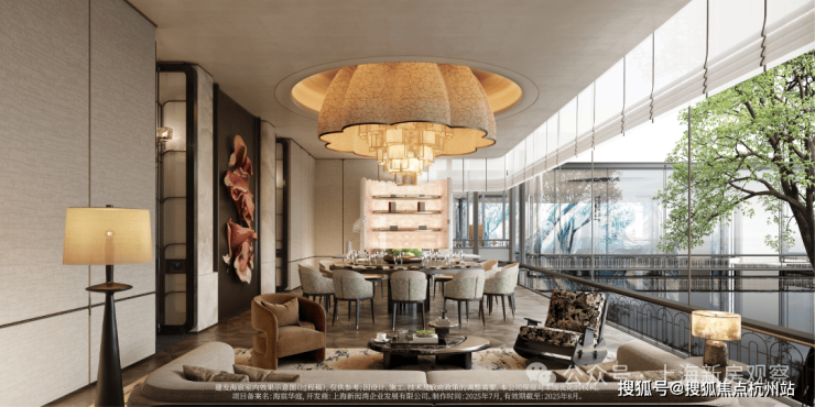 示范区以“玉兰门庭—迎归大堂—莳花荟”为核心轴线,运用非遗技艺与奢贵石材打造。约65米长玉兰门庭融合海派元素,9米挑高迎归大堂,汇集多位艺术家跨界作品,莳花荟中央会客厅再现海派社交场景。