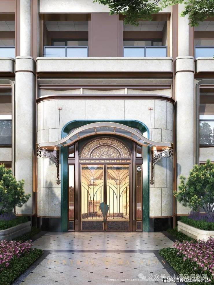 「玉兰门庭」摩登飘逸,环抱式落客前场,大师定制非遗掐丝珐琅门钹,流转温润光华,敬呈归家尊崇礼序,自此启幕生活的华贵序章。
