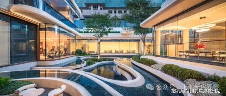 下沉式庭院,通过垂直景墙、悬浮观景台与叠水景观的立体交织,实现移步换景的视觉效果,也与会所空间形成无界交互。
