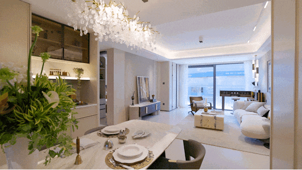 南向约9.3米超大面宽,搭配约3.3米的朗阔层高,营造出恢宏通透的空间尺度感。客厅与南向阳台完全打通,延伸出一片融于自然的阳光厅堂,推窗即见私家庭院,实现室内外场景的自由切换,演绎真正的墅居生活意境。