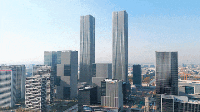 大幅通透的玻璃幕墙将天光云影尽纳其中,折射出现代审美与科技质感的光辉。整座建筑既庄重又轻盈,既具国际风范,又蕴含东方向上的精神意境。