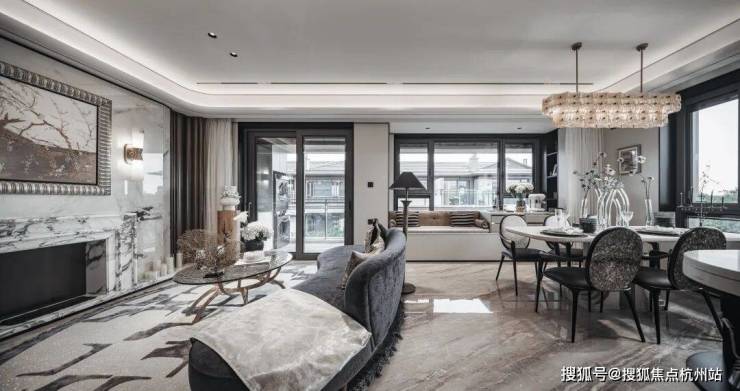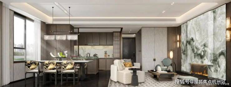 首先是奢石含量极高,从入户处的玲珑玉拼花与透光云石辉映,到翡翠绿奢石墙景、再到发光云石装饰点亮归家路,石材的典雅贯穿始终。