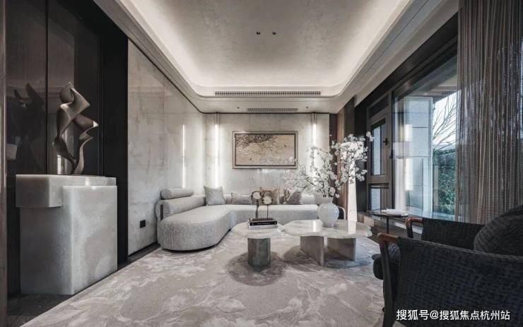 首先是奢石含量极高,从入户处的玲珑玉拼花与透光云石辉映,到翡翠绿奢石墙景、再到发光云石装饰点亮归家路,石材的典雅贯穿始终。