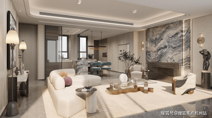 约1500m²恒温泳池会所及落差达约10米的水幕下沉式园林的打造,在奢石、臻材等元素的空间应用中,让显贵世家的社交场景,相映于粼粼碧波的柔光之中,于方寸之间游离世外。