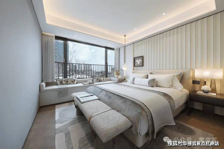 在春来晴翠园 建面约169㎡晴翠户型 中,最亮眼的设计显而易见—— 主卧90°转角窗,揽获270°环幕视野 ,将天光云影尽纳室内。不仅引入绝佳采光与风景,更成为一处心灵栖所。