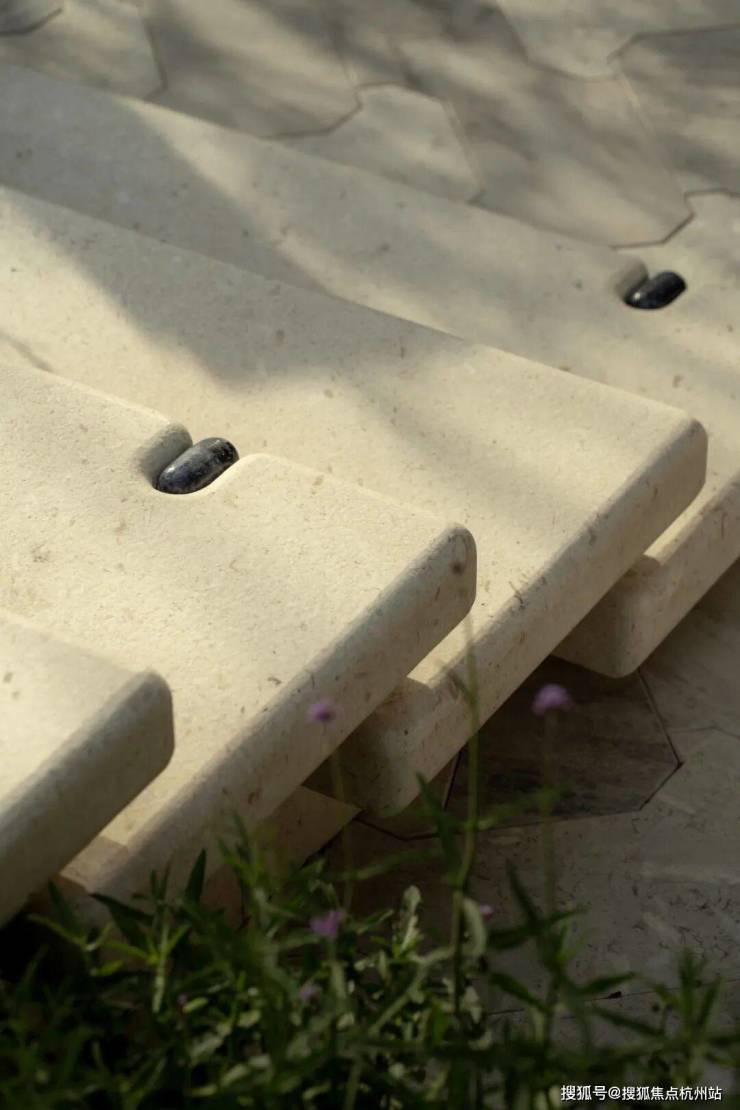 铺装延续柔和基调,米灰调石材温润而富有细腻变化,营造出高级的材质感受。图案上,景观转译了建筑的八边形语汇,通过现代手法将其咬合搭接,既延续了装饰艺术的基因,亦增添了一分时髦的未来气息。