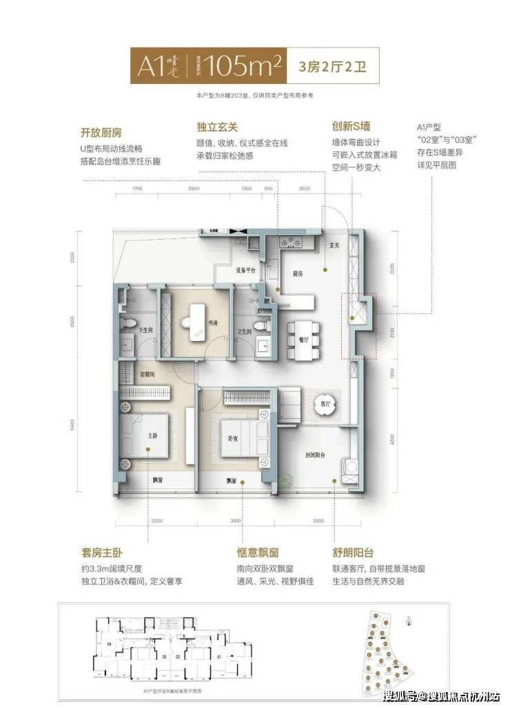 建面约105㎡晴光户型,不仅实现更优面积排布,更做到精神与审美的高度适配。在设计中,这间三房同样拥有南向大面宽,搭配S墙/开放式厨房/一体化餐客厅/多功能书房/酒店套房主卧等,将整个空间的开阔感和互动性做到极致,满足居住者对舒适、安逸的“精准需求”。
