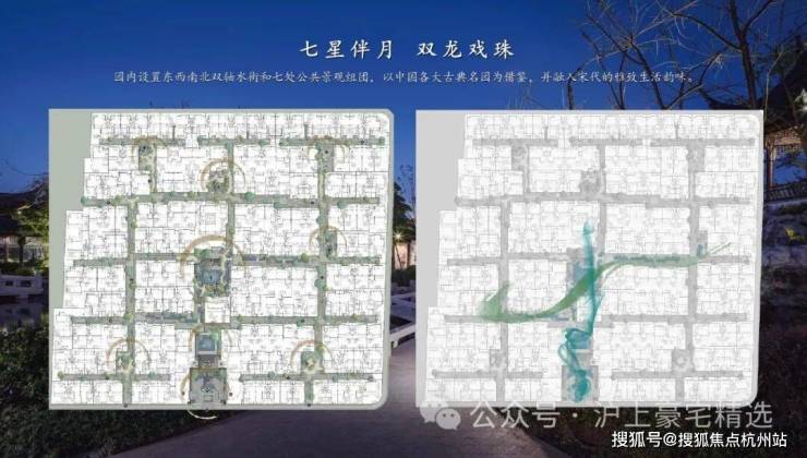 园内布局五进制南北主轴、以及“双龙戏水”格局的双水街,巷道联通,设七大景观组团,形成“一环、两轴、七境”布局。175席中式园宅,依巷分布南北,横平竖直,秩序井然。