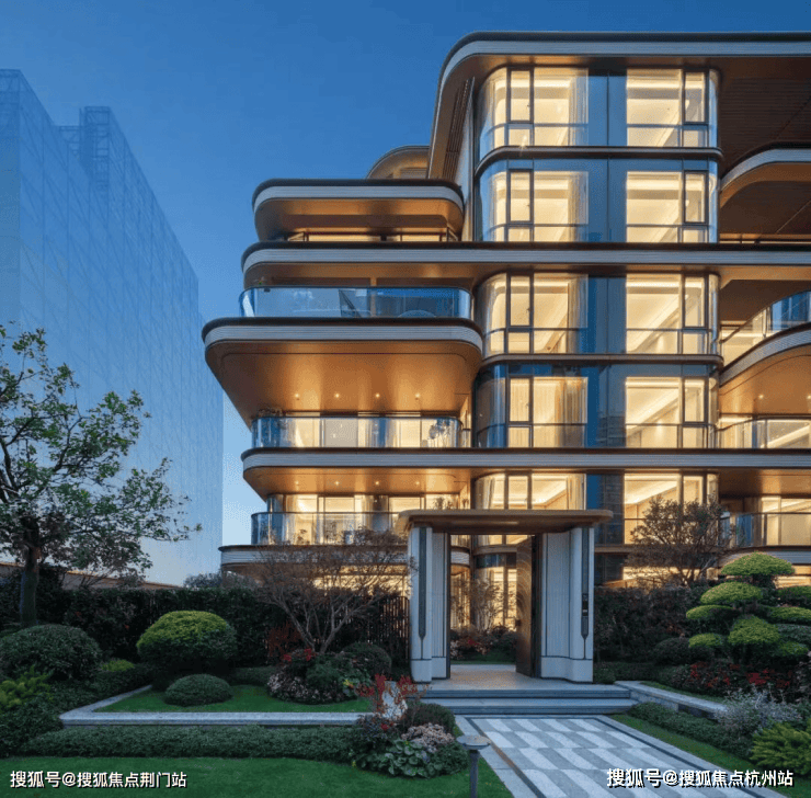 天澜传序府的外立面,用古铜金的铝板、「全面屏」般的大幅玻璃,还有钱塘江潮般的弧形曲线,搭配出了超强的精致度。这样的叠墅颜值,放在今年的杭州,都首屈一指。