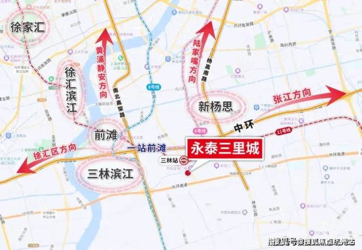 轨道交通方面:项目与11号线三林站直线距离仅约350米,步行可达,进站后1站即达前滩,2站即达徐汇滨江。