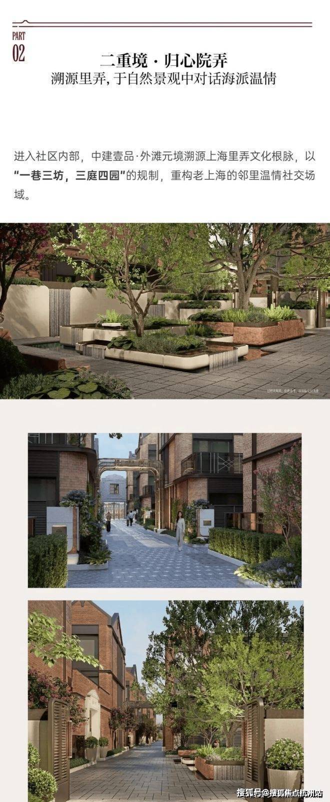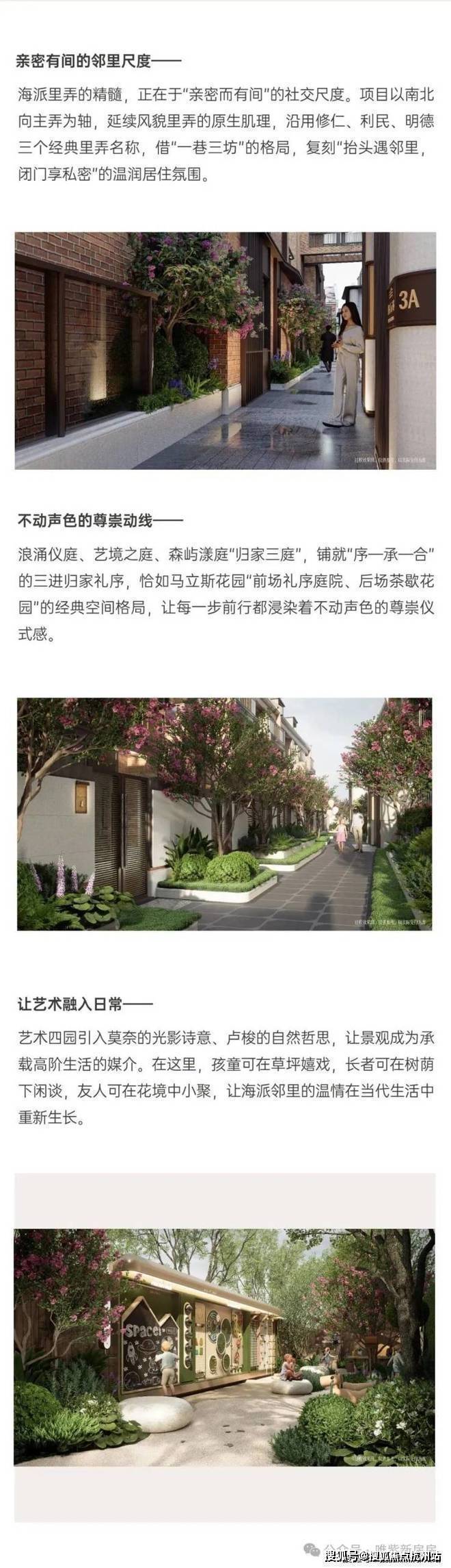 从设计理念上,充分尊重建筑原本肌理:项目整体布局规划由上海澜道环境设计操刀,以南北主弄为轴线,沿用修仁坊、利民里等旧称命名里弄,延续海派里弄的街巷肌理,一轴三里重现老上海的烟火气息。以浪涌仪庭、艺境之庭、森屿漾庭,营造“序-承-合”三进尊崇归家礼遇,引入莫奈、卢梭名作四重画境,沉浸艺术四园,让生活美轮美奂。