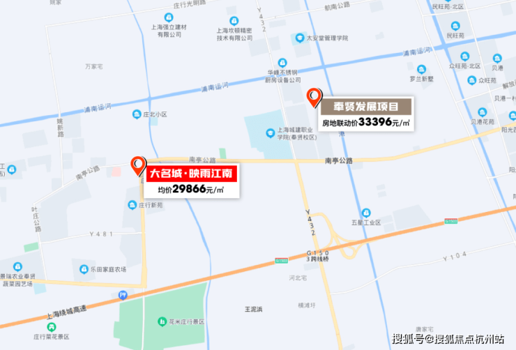 老闵行价格已达到5.9万/㎡,奉贤新城价格也在4万/㎡+,大名城·映雨江南均价29866元/㎡,价格差非常明显。
