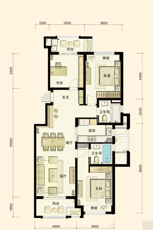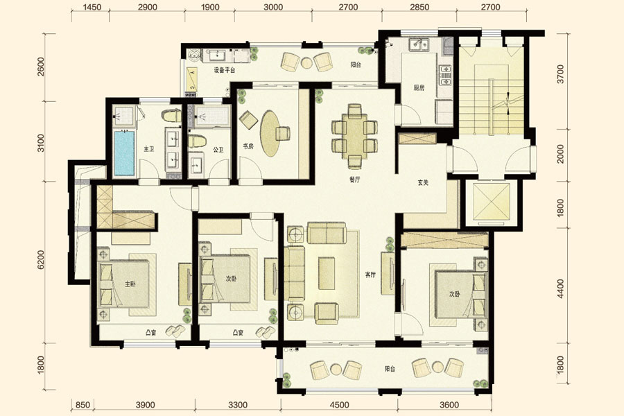 各个空间户型方正,后期空间利用率高;全明通透户型,居住舒适度较高,整个空间采光充足,利于后期居住;卫生间作为重要的空间,距离次卧较远,不方便主人使用。卧室作为休息区域,门朝向客厅或餐厅时,私密性一般;各个功能区的尺寸比例规范,布局合理,能很好地满足日常功能需求,整体空间开阔,采光充足,居住舒适度好;