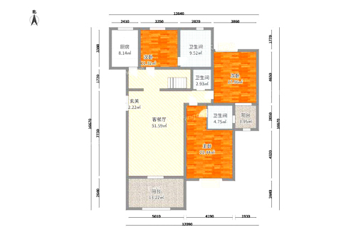 各个空间户型方正,方便室内家具布置;全明户型,各部分空间均有窗,可保证整体空间采光和通风,居住舒适度好;卫生间门朝向主要活动区域,私密性一般;卧室厨卫等各个功能区的面积大小都比较合理,居住体验便利,整体舒适度高;公摊高于25%。