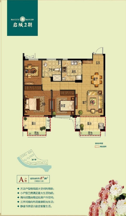 野风启城位于杭州钱江经济开发区康信路与兴盛路交叉处西北侧,西依横山港,北面和西面毗邻胡家文河,项目三面环水,环境优美,为原生态水景生活领地。项目可远眺超山风景区,向西和向北为丁山湖湿地和西大洋湿地,外部景观资源优良,得天独厚。野风启城占地面积约110亩,总建筑面积约20万mi,其中住宅面积约15万m,规划由花园洋房、小高层和高层组成,意将该项目打造成具有浓厚文化底蕴,建筑风格融合时尚现代主义和泛欧西班牙风情,格调高尚的生态休闲花园社区。本项目由杭州野风欣代房地产有限公司开发,国际知名的何显毅设计事务所担纲规划建筑设计,倾力打造野风出品的升级版高品质社区。野风启城户型设计根据现代人对空间划分思想和空间需求的研究,加强户型创新,小高层、高层户型面积从80- -180m,构筑灵动、温馨的家庭空间。花园洋房的户型面积在160-200m,拥有丰富的生活空间,属于高享受的电梯"类排屋”,让居者尽享舒适与优雅。野风启城配套也相当成熟: 园区内有多功能会所,为住户提供零距离生活配套享受;好又多超市、朱家角农贸市场,步行5分钟可达;大型商务综合体欣北钱江国际广场建成后商业、娱乐、休闲、酒店-应俱全;塘栖三小教育集团,教育质量上乘,有口皆碑。幼儿园硬件设施良好,师资力量优秀;余杭区中医院是一所集医疗、预防、教学、科研、康复为 一体的二级甲等中医院,为区域内居民提供便利医疗服务。