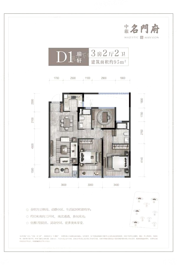 各个空间户型方正,方便室内家具布置;全明户型,各部分空间均有窗,可保证整体空间采光和通风,居住舒适度好;整个户型空间布局合理,做到了干湿分离、动静分离,方便后期生活;各个功能区的尺寸比例规范,布局合理,能很好地满足日常功能需求,整体空间开阔,采光充足,居住舒适度好;公摊高于15%且低于25%,符合住