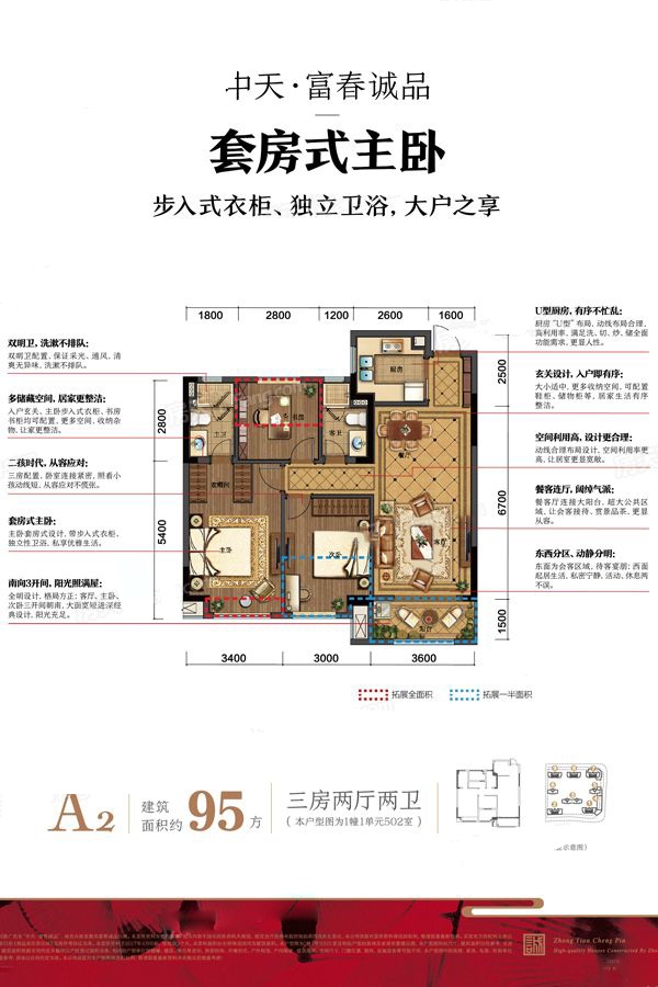 整体户型方正,活动区域开阔,居住舒适度高;全明户型,各部分空间均有窗,可保证整体空间采光和通风,居住舒适度好;整个户型空间布局合理,做到了干湿分离、动静分离,方便后期生活;各个功能区的尺寸比例规范,布局合理,能很好地满足日常功能需求,整体空间开阔,采光充足,居住舒适度好;
